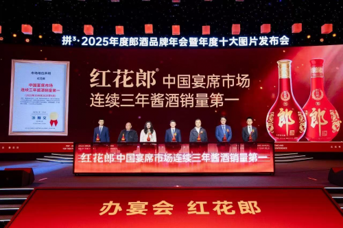 市场的认可,是对拼搏最有力的回响。活动现场,来自国际权威调查机构弗若斯特沙利文的认证,将气氛推向高潮。基于详实调研,沙利文正式确认:红花郎在中国宴席市场,连续三年(2022年10月至2025年9月)荣膺酱酒销量第一。