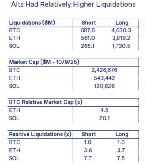 值得注意的是,ETH 和 SOL 的体量远小于 BTC。在暴跌之前,BTC 的市值约为 ETH 的 4.5 倍、SOL 的 20 倍。按体量调整后,ETH 的相对清算规模约为 BTC 的 3.7 倍,SOL 约为 BTC 的 7.6 倍。